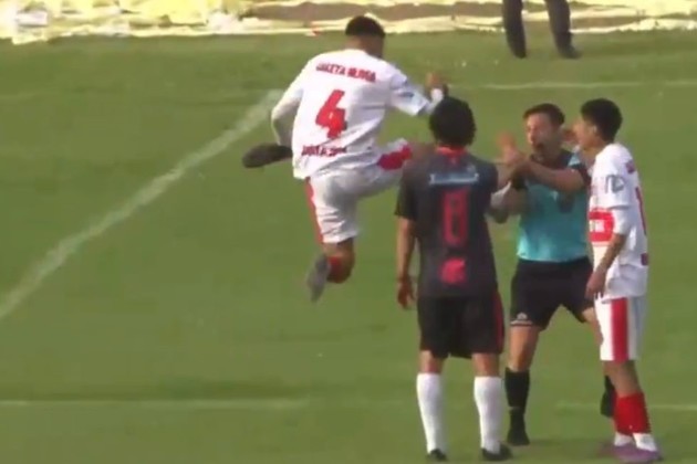 Al terminar el partido, futbolistas del elenco santacruceño se acercaron al árbitro Danilo Viola para protestar por algunos fallos. Fue allí cuando el número 4, Enzo Godoy, lanzó una patada voladora que fue interceptada por el juez.