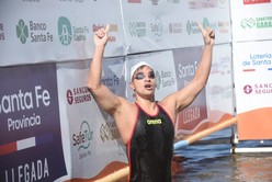 El santacruceño Matías Díaz Hernández tras tocar primero el pontón de llegada e inscribir su nombre en la tradicional prueba de aguas abiertas. Crédito: Archivo.