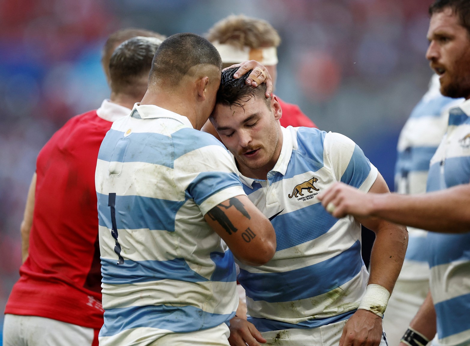 8 / 10 Los jugadores argentinos se apiñan durante el partido. Copa Mundial de Rugby 2023 - Cuartos de final - Gales contra Argentina - Velódromo Orange, Marsella, Francia. Foto: STEPHANIE LECOCQ