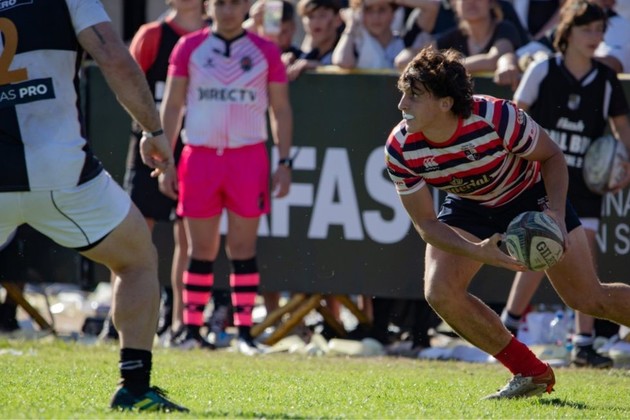 Juan Cruz Strada a punto de abrir juego. El medio scrum se consolidó rápidamente en la primera de Santa Fe Rugby Club. Crédito: José Caputto.