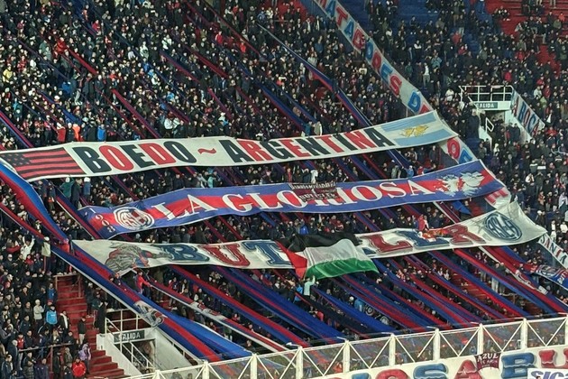 Este lunes en el partido entre San Lorenzo y Lanús por la fecha 2 de la Liga Profesional de Fútbol, la hinchada del Ciclón desplegó en su tribuna una bandera de Palestina.