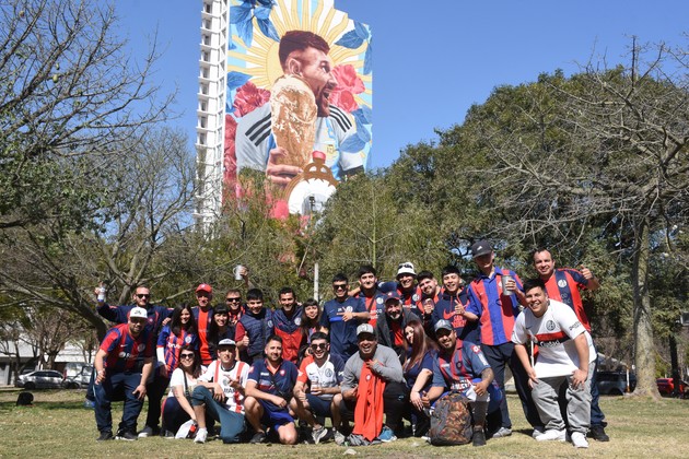 Llegados desde Boedo, un grupo de personas se reunió a las afueras de la terminal de ómnibus de Santa Fe, en el predio ferial y a metros del mural récord de Lionel Messi.