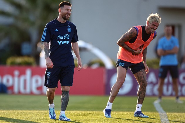 Lionel Messi y Rodrigo De Paul durante el entrenamiento. Crédito: Reuters/Agustin Marcarian