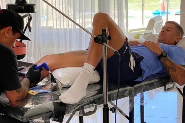 La persona que lo tatúa es Yeyo, quien también hizo lo propio con Pablo Hernández, que se hizo en su cuádriceps izquierdo un impresionante tatuaje de Diego Maradona levantando la Copa del Mundo en el Mundial de México 1986.