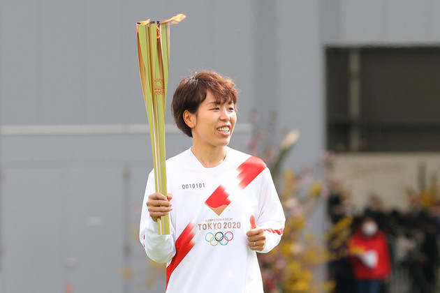 La antorcha de oro rosa, que tiene en el extremo superior forma de flor de cerezo, fue encendida en el complejo deportivo J-Pueblo, exbase de operaciones en la catástrofe nuclear de 2011, y transportada en su primer tramo por las integrantes del equipo femenino de fútbol de Japón.