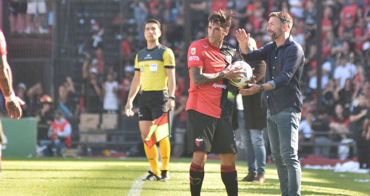 Fue "Más" de lo mismo. El cariñoso saludo de Emmanuel Más, lateral izquierdo sabalero, para con el "Kily" Cristian Alberto González, entrenador de Unión. Si uno mira la parte baja de la tabla, el famoso "uno por uno" no fue negocio para ninguno. Crédito: Mauricio Garín