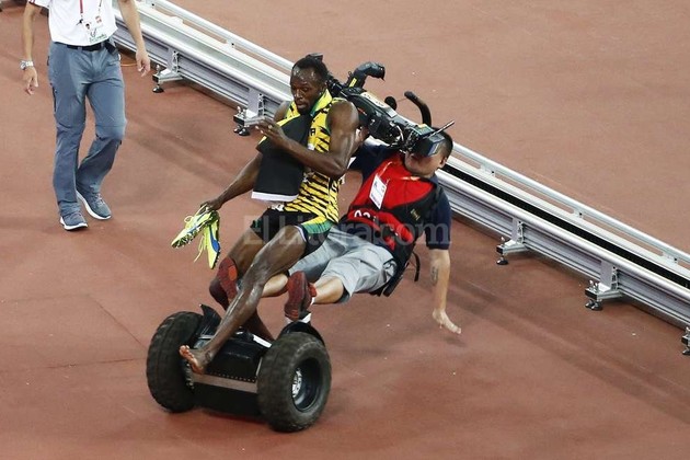 Mientras celebraba su oro mundial de los 200 metros en el Estadio Nacional de Pekín, Usain Bolt fue arrollado hoy por un cámara de televisión que rodaba en un segway (vehículo motorizado de dos ruedas).