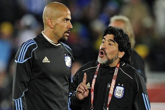 La primera de Maradona con la camiseta del seleccionado argentino, la otra de la etapa que coincidieron como jugadores en Boca Juniors y la última de Diego como DT y Verón como su dirigido en la "albiceleste", durante el Mundial de Sudáfrica 2010.