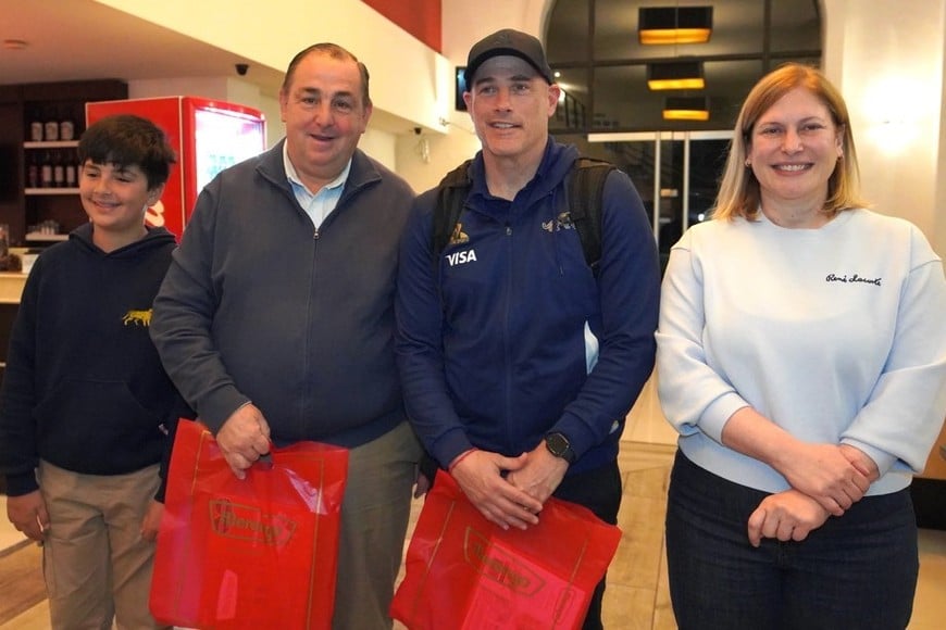 "Bienvenidos a Santa Fe". La vicegobernadora Gisela Scaglia y el intendente Juan Pablo Poletti recibieron a Los Pumas en el Hotel de Campo Colón, entregándole obsequios al entrenador del seleccionado argentino de rugby, Felipe Contepomi. Foto: Fernando Nicola