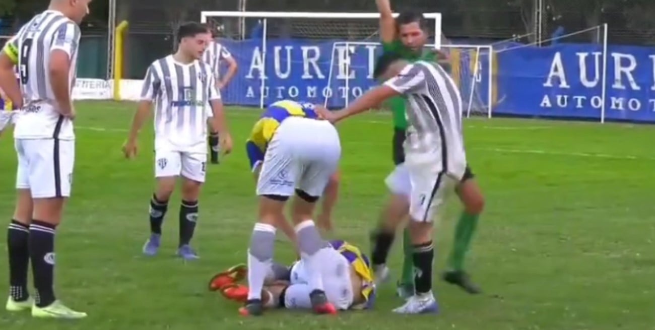 Fue cuando el lateral izquierdo de Cafferatense le realizó una dura falta a su rival, quien tendido en el suelo tras el golpe, recibió una segunda y aún más dura patada por parte del infractor.