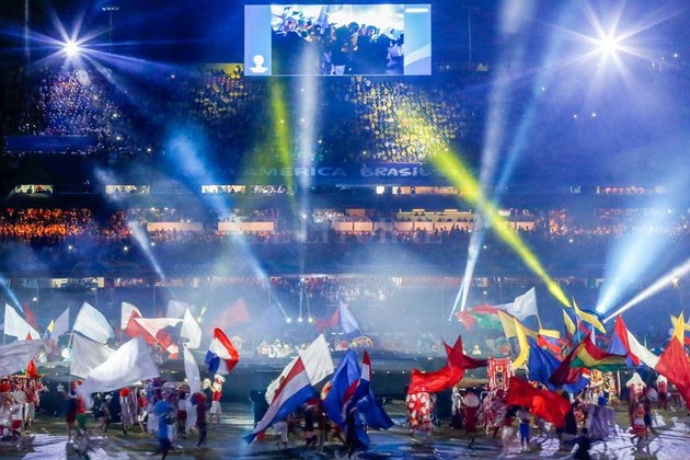 El espectáculo, de unos quince minutos de duración, se desplegó sobre el césped del estadio instantes antes del partido entre Brasil y Bolivia, detalló la agencia española EFE.