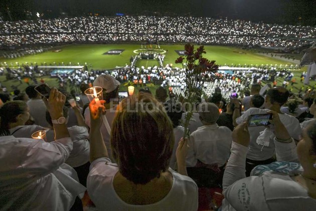 Todos los aficionados llegaron al estadio ataviados con prendas blancas, portando velas encendidas y dispuestos a hacer un minuto de silencio para recordar a los fallecidos en este accidente que dejó a seis sobrevivientes, cuatro de ellos futbolistas.
