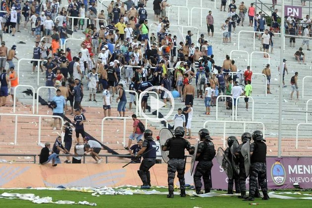 En ese momento, un grupo de unas 50 personas comenzó a arrancar las butacas y arrojarlas al terreno de juego, y posteriormente se enfrentaron con la Policía, dejando un saldo de unos 32 efectivos heridos, según consigna el diario Los Andes.