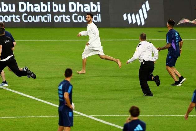 Como ocurrió en varias ocasiones y en distintos países que vistió la Selección Argentina, mientras se desarrollaba el entrenamiento, tres hinchas ingresaron al campo de juego para conseguir acercarse a Lionel Messi.