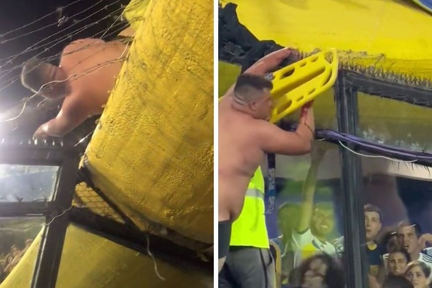 De hecho, antes de completar su descenso, quedó literalmente colgado de su brazo izquierdo y semidesnudo. Según informaron, el equipo de emergencias que hacía guardia en la Bombonera lo retiró en camilla hacia el hospital más cercano.