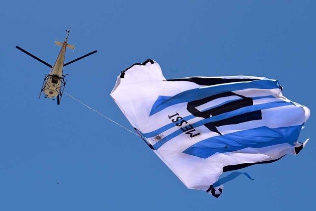 Durante el mediodía de este martes y a pocas horas de la semifinal ante Croacia, un helicóptero sobrevoló el cielo rosarino con la inmensa casaca. Para sorpresa de los desprevenidos, la gran camiseta apareció en cercanías al Río Paraná y al Monumento de la Bandera.