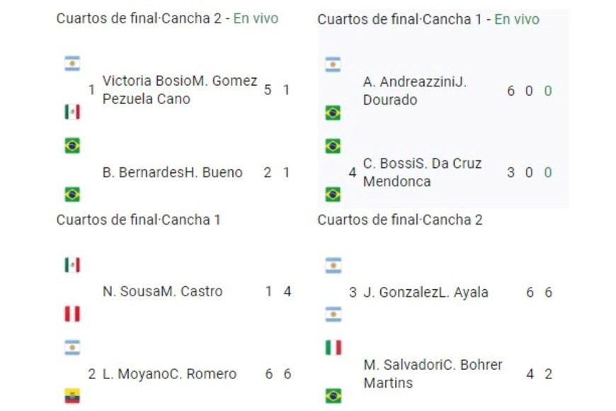En el torneo paralelo de dobles, Victoria Bosio y su compañera la mexicana Marian Gómez Pezuela Cano, se enfrentan por los cuartos de final ante la dupla de las brasileñas Bianca Mendonca Bernardes Bia Bernardes y Helena Bueno.