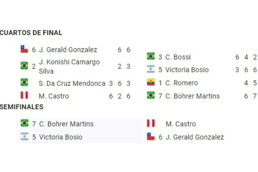 En semifinales, Bosio tendrá enfrente a otra carioca, Carolina Bohrer Martins (7ma. preclasificada y 1091 del mundo), que viene de eliminar a la argentina Katja Markus (1244) por 6-3 7-6(5).