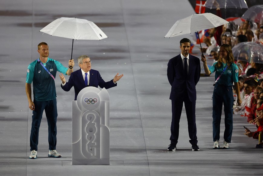 Antes del que se encienda el pebetero, habló Tony Estanguet, ex deportista francés y tres veces medallista de oro. Luego, le siguió Tomas Bach, presidente del Comité Olímpico Internacional. Cerró el presidente de Francia, Emmanuel Macron.