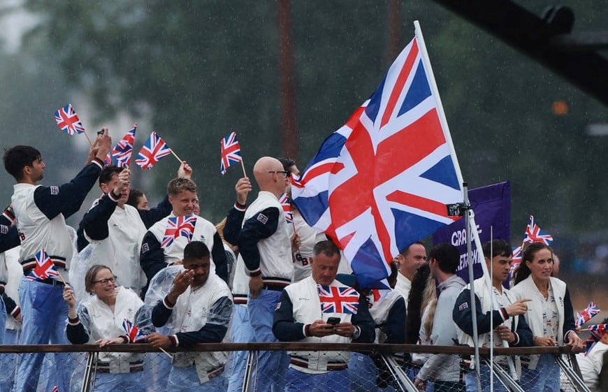 La delegación local navega en el último de los 85 barcos de un innovador desfile olímpico.