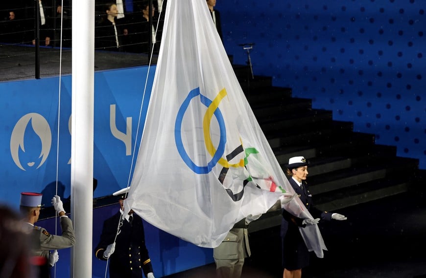 Es izada al ritmo de un Himno Olímpico interpretado por 60 coristas de Radio France Choir y 90 músicos de la Orquesta Nacional de Francia.