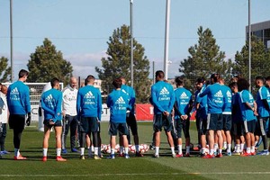En una foto difundida por el club merengue se puede ver Zidane, acompañado de su cuerpo técnico, dando una charla a sus jugadores, colocados delante de él, entre los que se distingue, entre otros, a Gareth Bale, Keylor Navas, Marcelo o Francisco Alarcón Isco.