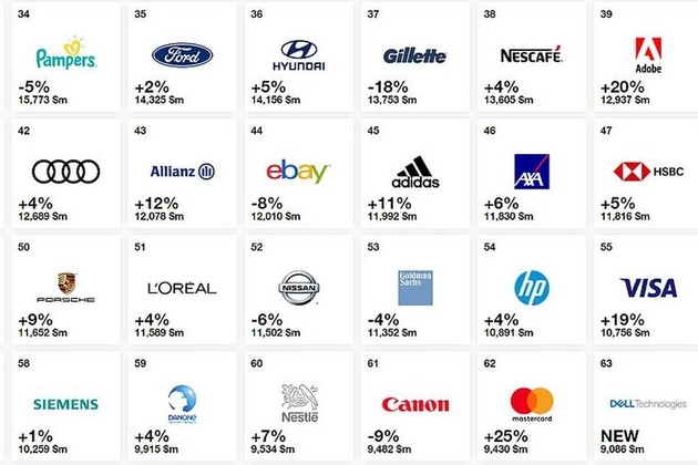 Además, hay una reincorporación: tras seis años de ausencia y con su vuelta a la cotización bursátil, Dell reaparece en Best Global Brands con un valor de 9.086 millones de dólares, cifra que le vale el puesto 63 de la lista.