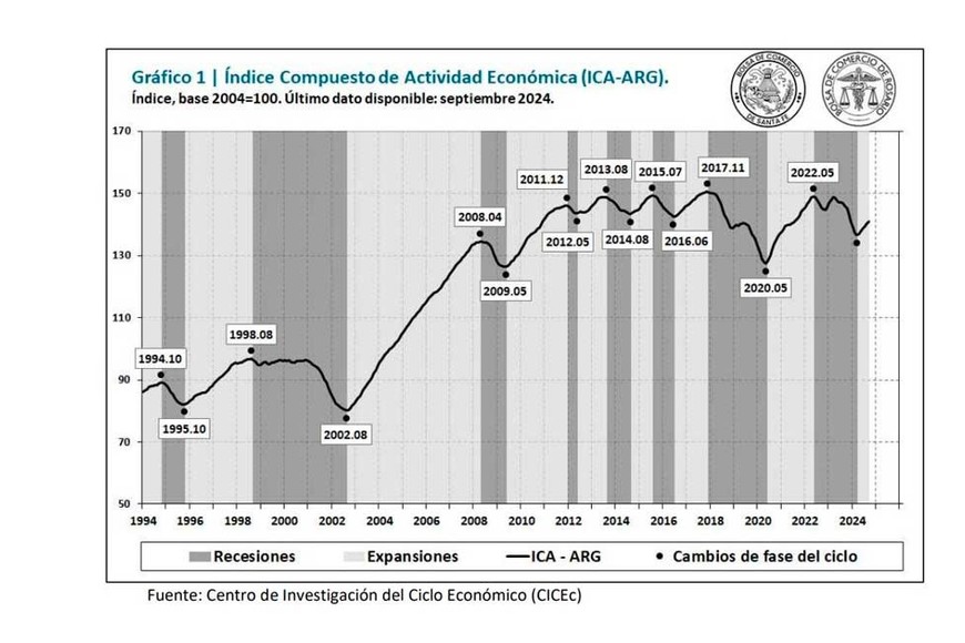 "El Índice Compuesto Coincidente de Actividad Económica de Argentina (ICA-ARG) tuvo una variación de 0,5% en septiembre, encadenando su sexto mes consecutivo de evolución positiva. Así, los datos disponibles a la fecha brindan evidencia de que se ha dejado atrás la recesión, dando lugar a un valle de la actividad, de manera provisoria". El informe que elabora el Centro de Investigación del Ciclo Económico de las Bolsas de Santa Fe y Rosario señala que en seis meses el ICA-ARG "mostró un avance de 3,1%, recuperando casi toda la caída observada los tres primeros meses del año, y alcanzando así un nivel similar al de diciembre de 2023.