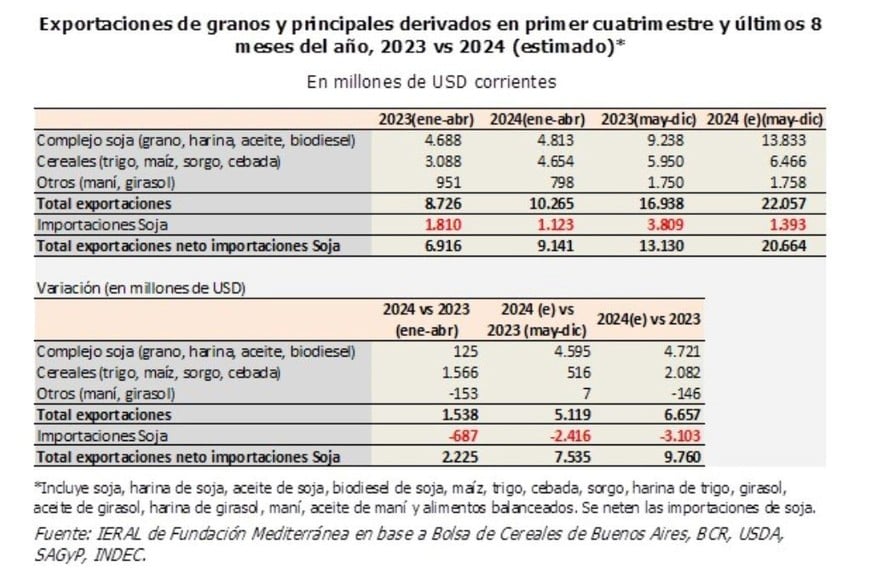 "Focalizando en las exportaciones netas, en los primeros cuatro meses del año se aproximaron a US$ 9,1 mil millones, lo que representan US$ 2,2mil millones ( +32% interanual) por encima de lo que sucedió en el mismo período de 2023. "Para lo que resta del año (mayo-diciembre) se proyectan envíos por US$ 20,6 mil millones (+US$ 7,5 mil millones, +57% interanual).