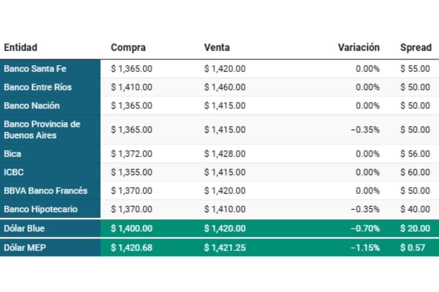 El dólar mostró variaciones: en bancos se mantuvo estable con leves bajas en algunas entidades. El blue cerró en $1.400 para la compra y $1.420 para la venta, mientras que el MEP terminó en $1.420,68 y $1.421,25, con una baja del 1,15%.