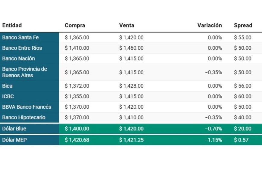 El dólar cerró con movimientos dispares y estabilidad en bancos. El MEP bajó 1,15%, cotizando $1.420,68 para la compra y $1.421,25 para la venta, con un spread de $0,57. El blue cayó 0,70%, cerrando en $1.400/$1.420, con el spread estable en $20.