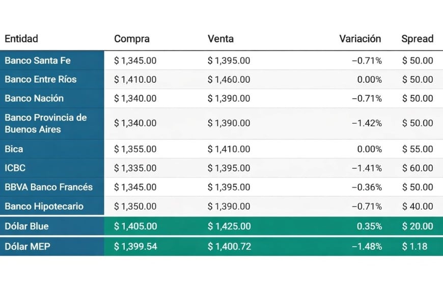 El dólar mostró bajas en bancos, mientras que el blue subió 0,35% y cerró en $1.405 para la compra y $1.425 para la venta, y el MEP cayó 1,48% hasta ubicarse en $1.399,54 y $1.400,72.