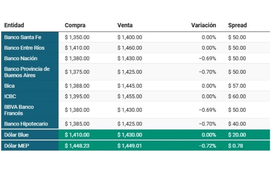 En Banco Nación, la divisa se ubicó en $1.380 y $1.430, con una caída de 0,69% y un spread de $50. El MEP registró un spread de $0,78, con bajas en ambas puntas respecto a la jornada previa.