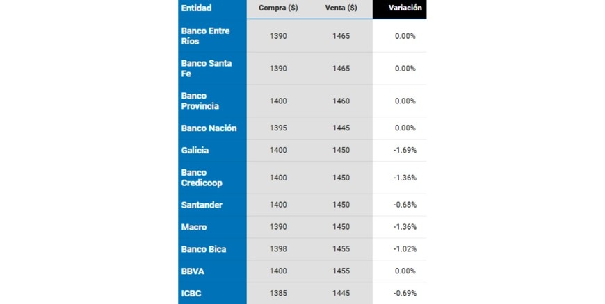 En tanto, BBVA Francés operó en $ 1.405,00 para la compra, $ 1.460,00 para la venta. Mientras que Banco Provincia (Bs.As.) hizo lo propio con los siguientes precios: $ 1.400,00 para la compra, $ 1.460,00 para la venta. Finalmente, Banco Galicia comercializó el dólar con los siguientes precios: $ 1.415,00 para la compra, $ 1.465,00 para la venta.