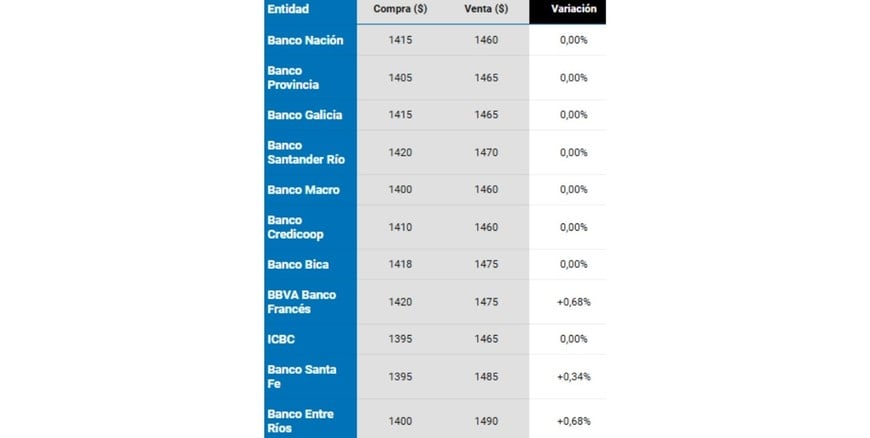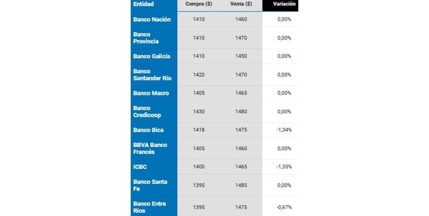 La semana pasada cerró con caídas en el dólar oficial en la mayoría de los bancos, situación similar para el Blue. En el Nación descendió a $1.4600 para la venta y $1.410 para la compra, cifras en las que abre este jueves 30 de octubre.