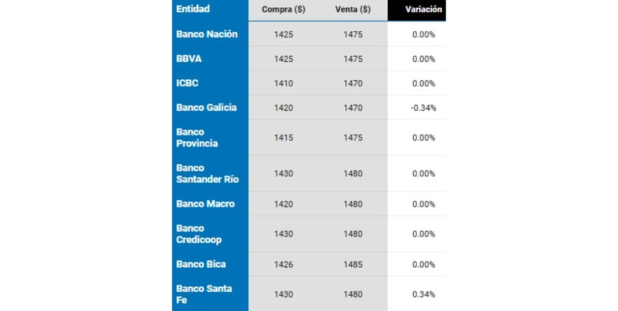 La semana pasada cerró con leves aumentos en el dólar oficial en algunos bancos, caso contrario al del Blue que bajó. En el Nación se sostuvo a $1.475 para la venta y $1.425 para la compra, cifras en las que abre este viernes 28 de noviembre.