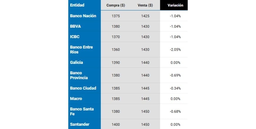 El dólar “blue” se ofrecerá $ 1.380 y $ 1.430 para ambas cotizaciones. En tanto, el dólar mayorista lo hará a $ 1.395 y $ 1.405 para ambas puntas.
