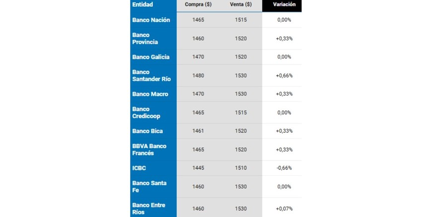 La semana pasada cerró con aumentos en el dólar oficial dependiendo del banco, mientras que el Blue avanzó con más fuerza. En el Nación se sostuvo a $1.515 para la venta y $1.465 para la compra, cifras en las que abre este miércoles 22 de octubre.