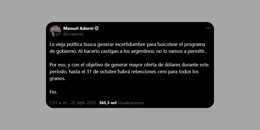 En una medida de carácter excepcional, el Gobierno Nacional anunció la eliminación de las retenciones a la exportación de todos los granos hasta el 31 de octubre. El objetivo principal es incentivar la liquidación de divisas por parte del sector agroexportador y aumentar así la oferta de dólares en el mercado cambiario.