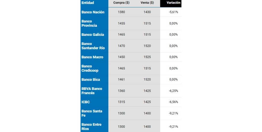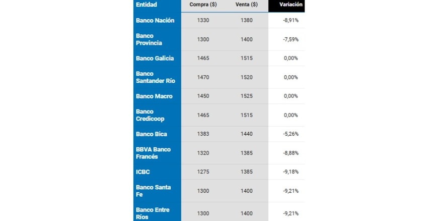 La mayoría de los bancos presentan bajas de más de $60, dejando la venta del dólar rondando los $1450. Banco Nación opera la moneda estadounidense en $1400 (compra) y $1450 (venta), $65 menos que en el último cierre.