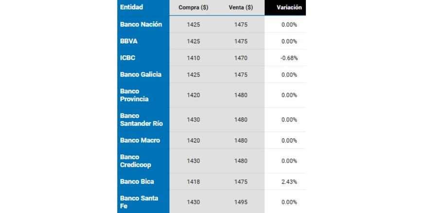La semana pasada cerró con leves aumentos en el dólar oficial en algunos bancos, caso contrario al del Blue que bajó. En el Nación subió a $1.475 para la venta y $1.425 para la compra, cifras en las que abre este jueves 27 de noviembre.