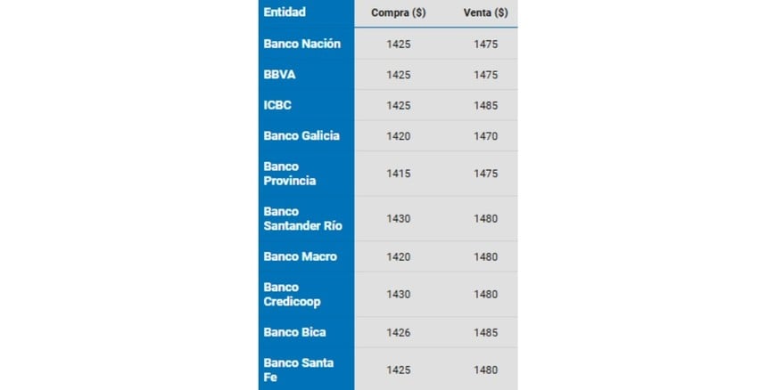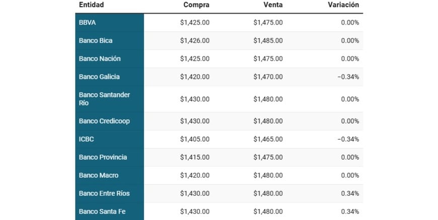 El dólar oficial en el Banco Nación cotiza a $ 1.425 para la compra y $ 1.475 para la venta, sin cambios respecto al último cierre.
