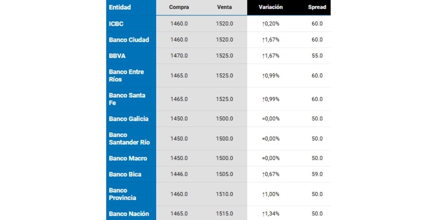 En tanto, Banco Galicia ofrecía los siguientes valores: $ 1.450,00 para la compra; $ 1.500,00 para la venta. Mientras que Santander terminó con los siguientes valores: $ 1.450,00 para la compra; $1.500 para la venta. Banco Bica tuvo el dólar a $ 1.436,00 para la compra; $ 1.495,00 para la venta. Por su parte, Banco Provincia (Bs.As) comercializó a: $ 1.445,00 para la compra; $ 1.495,00 para la venta. Por último, Banco BBVA Francés terminó el jueves con estos valores: $ 1.450,00 para la compra; $ 1.500,00 para la venta.