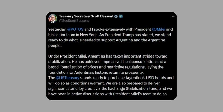 “El Tesoro está negociando actualmente con las autoridades argentinas una línea swap de 20.000 millones de dólares con el Banco Central. Trabajamos en estrecha coordinación con el gobierno argentino para evitar una volatilidad excesiva”, expresó Bessent en su cuenta de X.