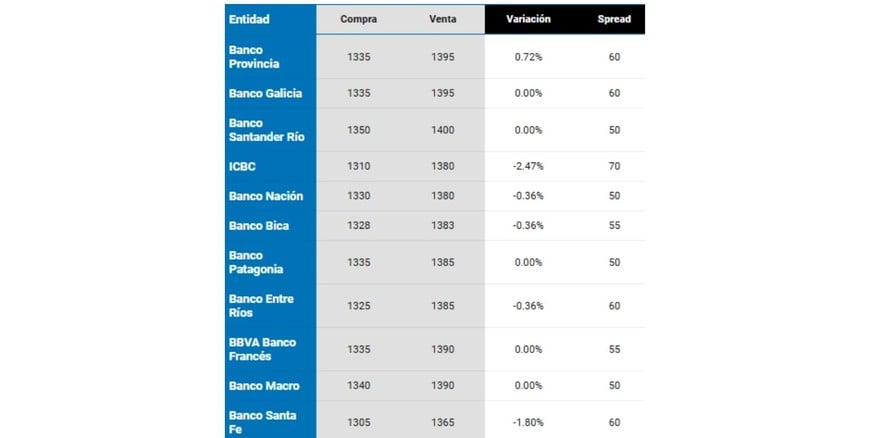 El dólar “blue” se ofrecerá a $ 1.390 y $ 1.410 para ambas cotizaciones. En tanto, el MEP lo hará en $ 1.338 y el Contado con Liquidación en $ 1.391.