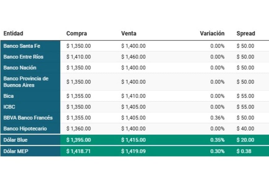 En tanto, el dólar MEP también mostró un leve avance de 0,30% y cerró en $1.418,71 para la compra y $1.419,09 para la venta. La brecha entre ambas cotizaciones se mantuvo acotada, en un contexto de movimientos moderados en el mercado cambiario.