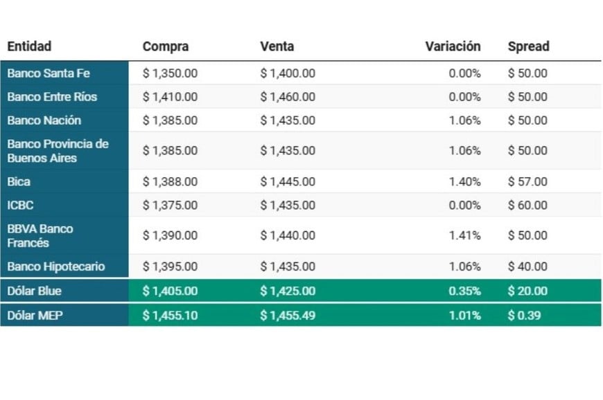 Banco Entre Ríos: $1.410,00 para la compra y $1.460,00 para la venta.