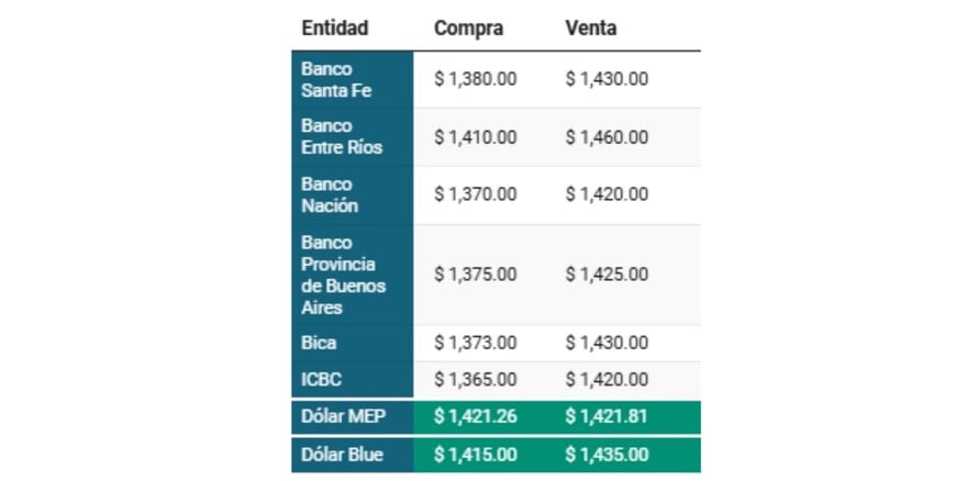 Dólar MEP: Compra: $ 1.408,15 Venta:$ 1.408,78