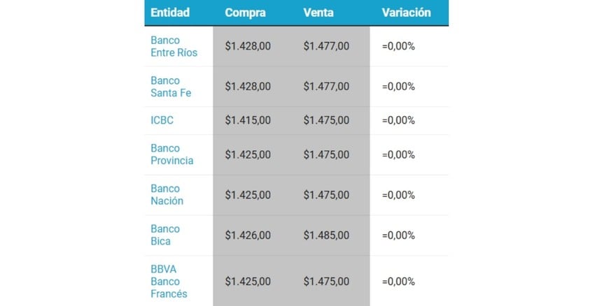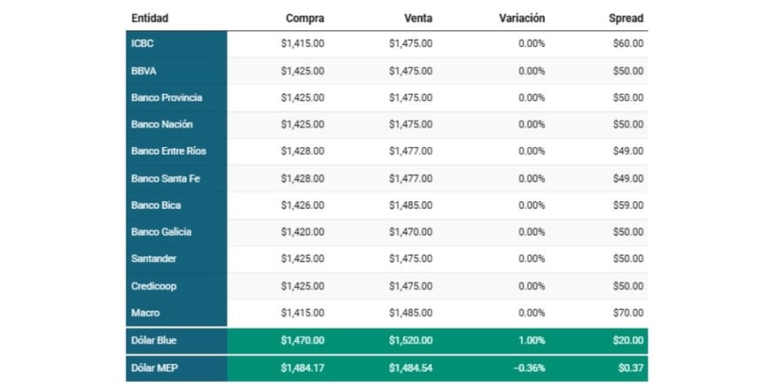 El dólar cerró el viernes con un comportamiento dispar. Mientras la mayoría de los bancos mantuvo sus valores sin cambios relevantes, el dólar blue avanzó con fuerza y el MEP mostró una baja moderada, en una jornada marcada por movimientos puntuales y spreads elevados en algunas entidades. El cierre en Banco Nación tuvo a la moneda extranjera en $1425 para la compra, $1475 para la venta.