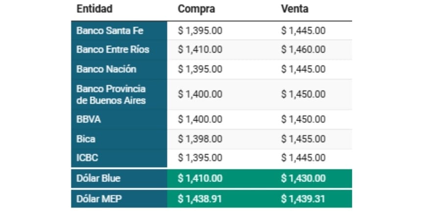 El dólar minorista cerró con valores dispares según la entidad: en los bancos relevados, la venta se movió entre $1.445 y $1.460. En paralelo, el dólar blue y el MEP tuvieron bajas. El cierre en Banco Nación tuvo a la moneda extranjera en $1395 para la compra, $1445 para la venta.